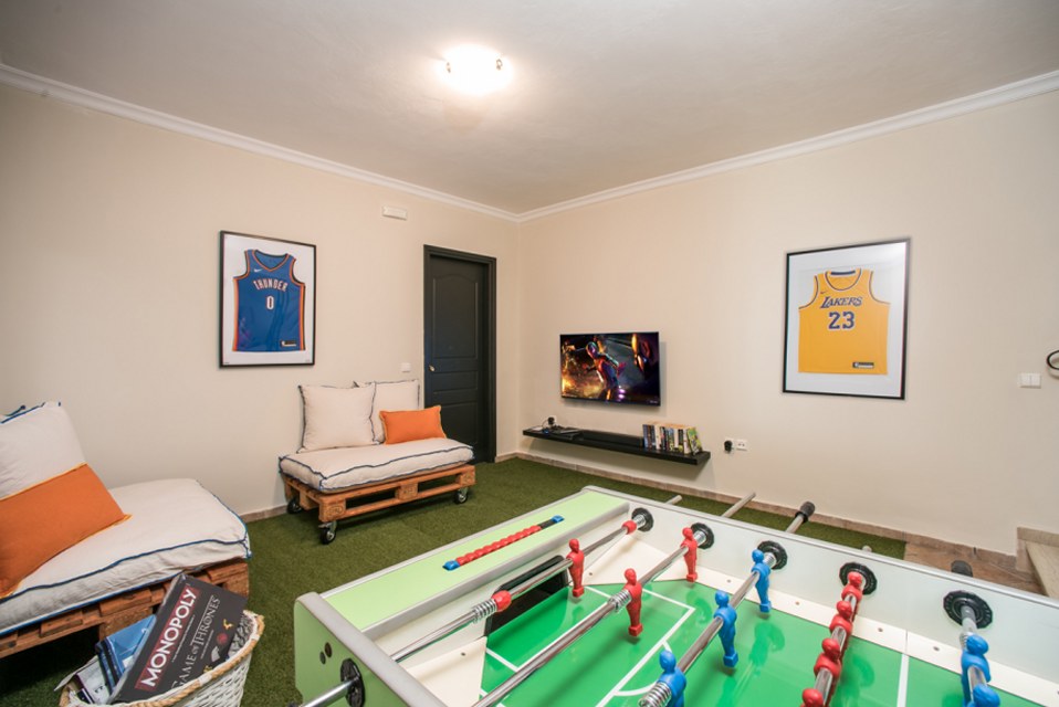Outside, a stunning 18-metre pool surrounded by sun loungers and lush gardens invites lazy days in the sun. A built-in barbecue and shaded dining area set the scene for unforgettable evenings under the stars.