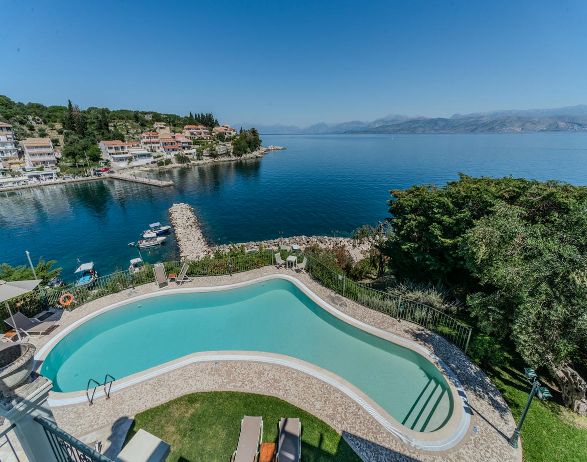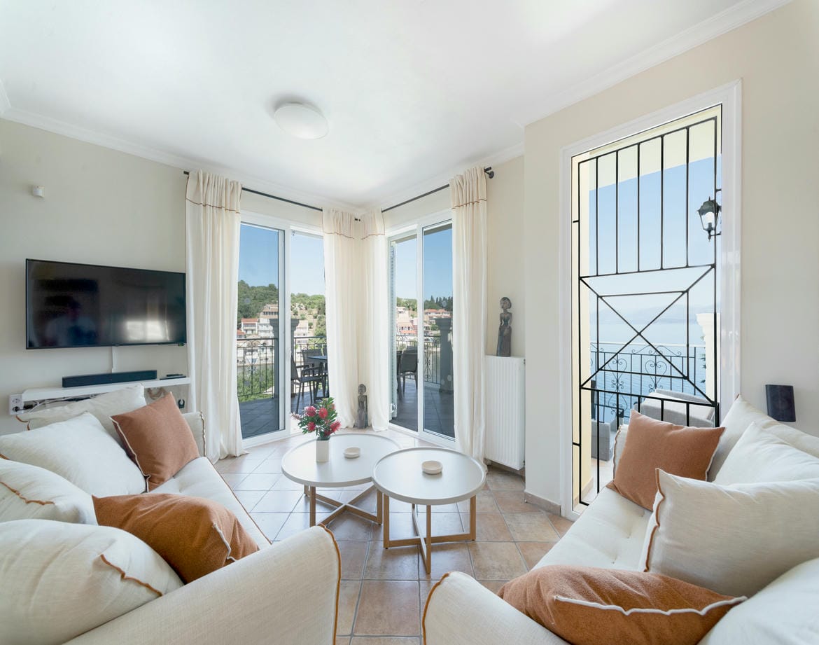 Perched above Kassiopi’s charming harbour, Villa Aphrodite is a 4 bedroom villa combining elegant design with breathtaking sea and castle views. Bright and spacious, the villa’s main level features an open-plan living area with a fireplace, a fully equipped kitchen, and a large veranda perfect for dining or relaxing while watching the boats drift by.