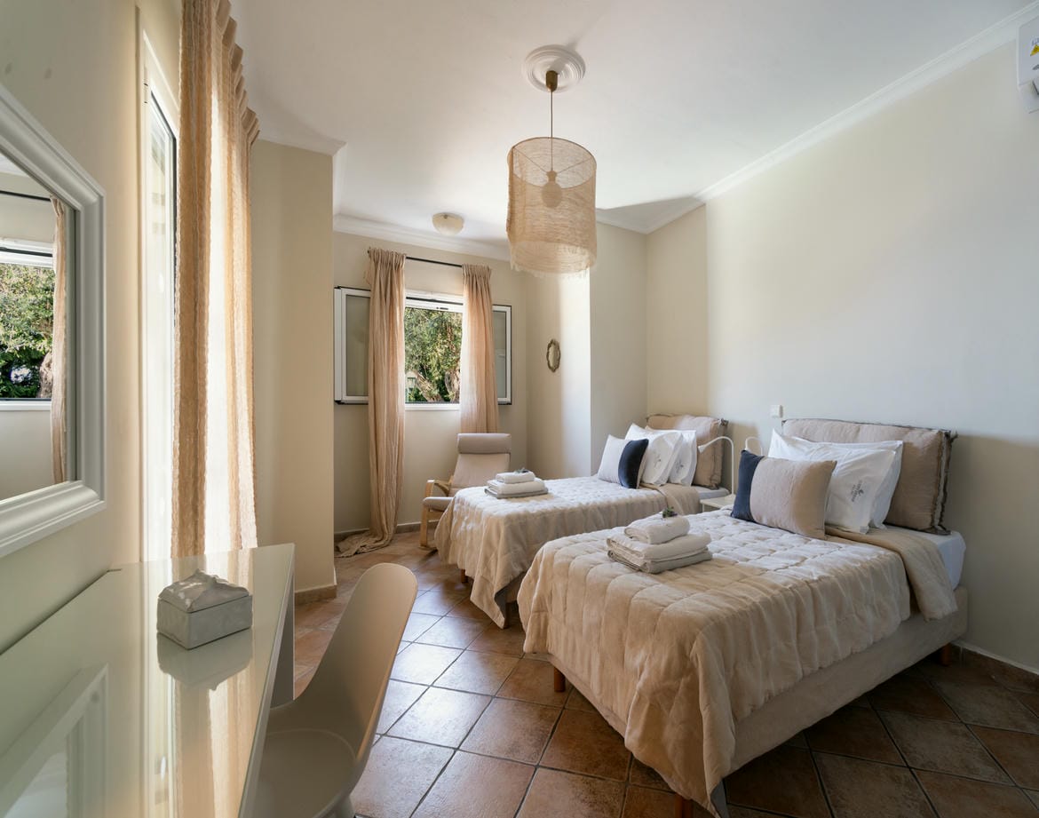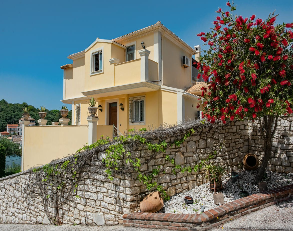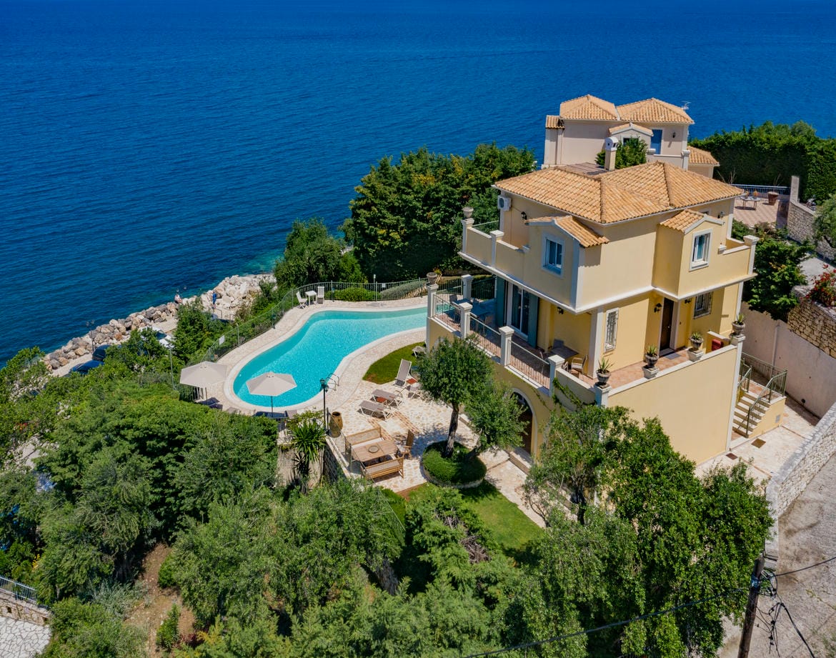 The lower level includes a playroom with a kitchenette and two ensuite bedrooms opening onto the garden terrace, while the upper floor offers two more ensuite bedrooms with private balconies overlooking the Ionian Sea.