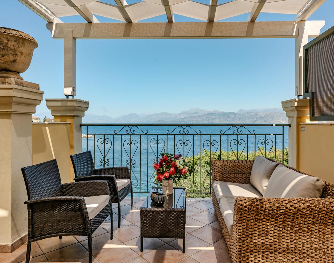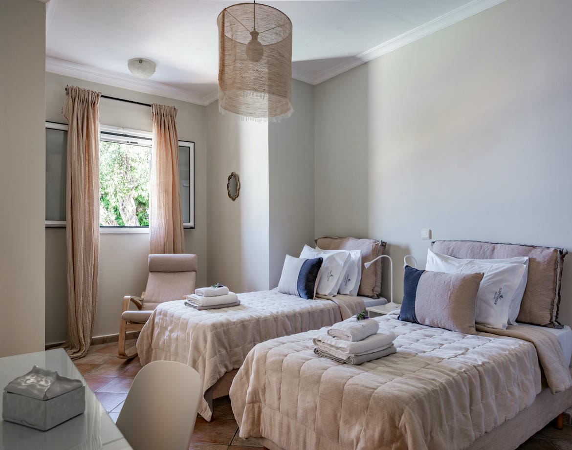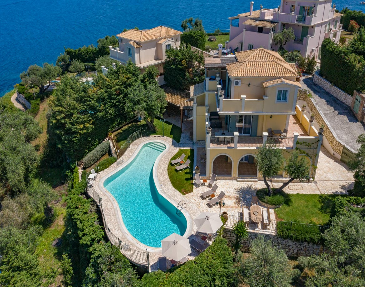 The lower level includes a playroom with a kitchenette and two ensuite bedrooms opening onto the garden terrace, while the upper floor offers two more ensuite bedrooms with private balconies overlooking the Ionian Sea.