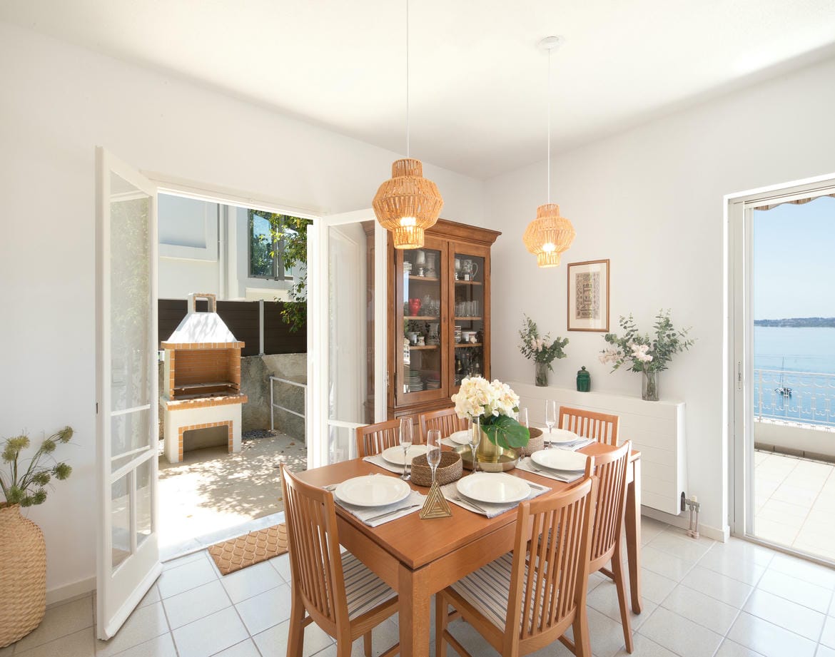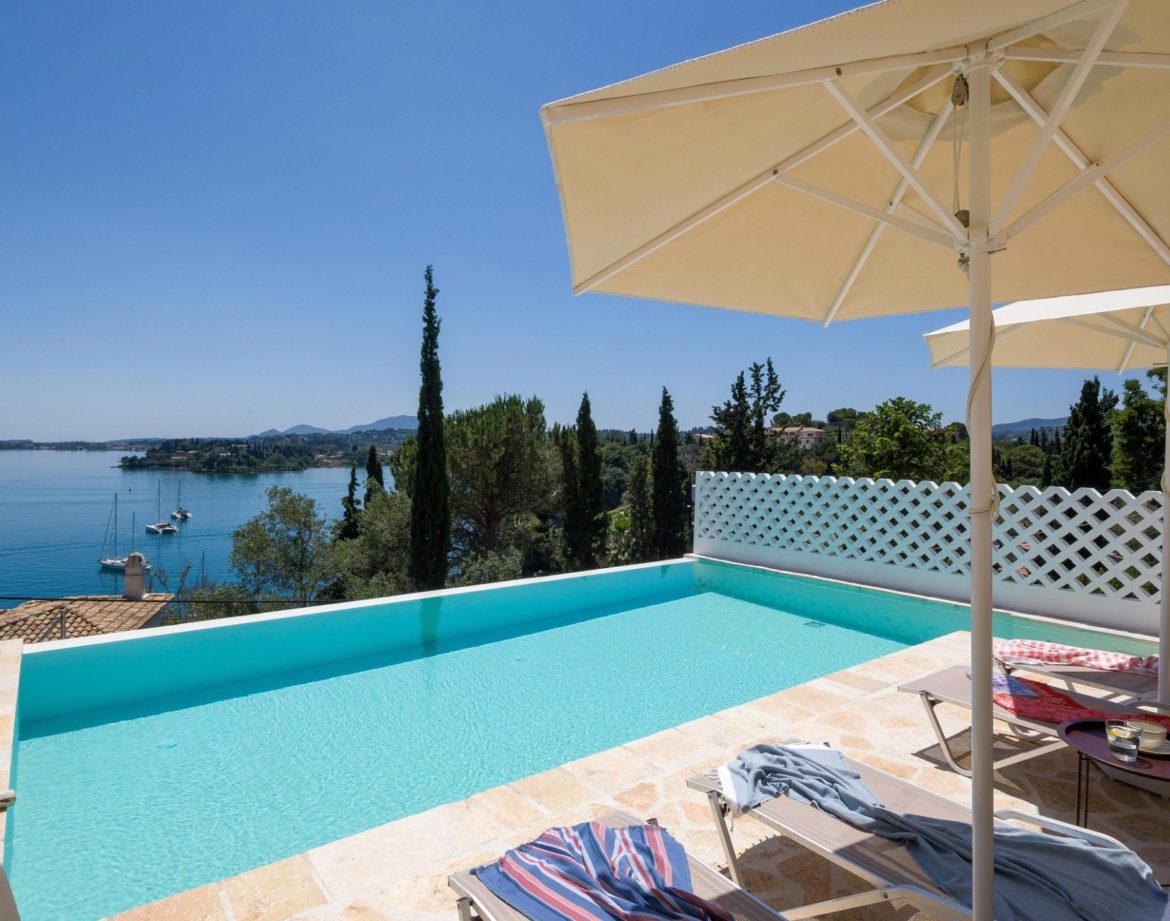 From its elevated position, nestled above the narrow coastal lane which meanders its way around the small peninsular, this delightful property enjoys the most magical views and overlooks one of Corfu’s most picturesque bays. Across this lane, the villa has its own gate with access down to the waters edge and a private swimming platform to relax and swim from in the crystal clear water.