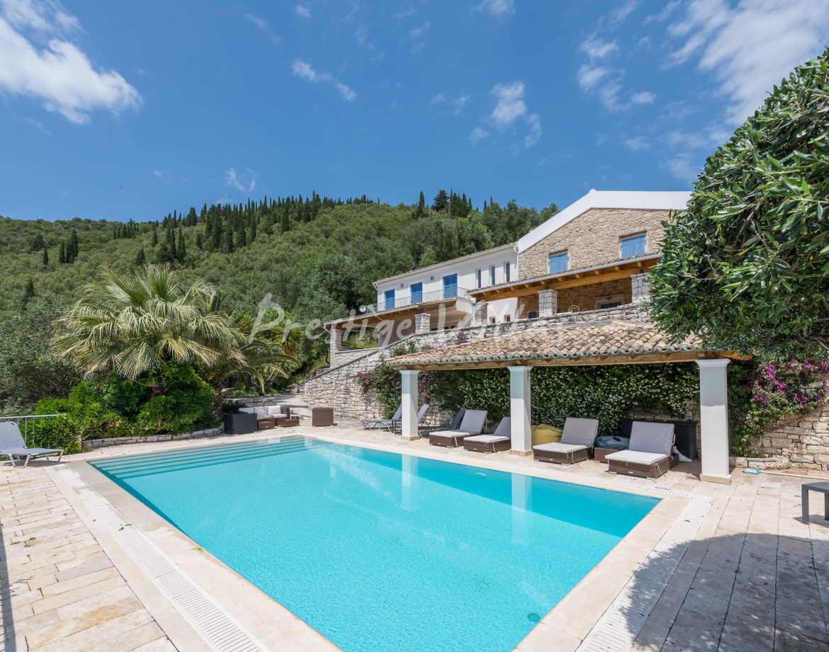 The spacious pool area lies just below the house, surrounded by flagged stone terraces and lush tropical foliage, offering complete privacy and breathtaking views down the valley to the crystal-blue Ionian Sea.