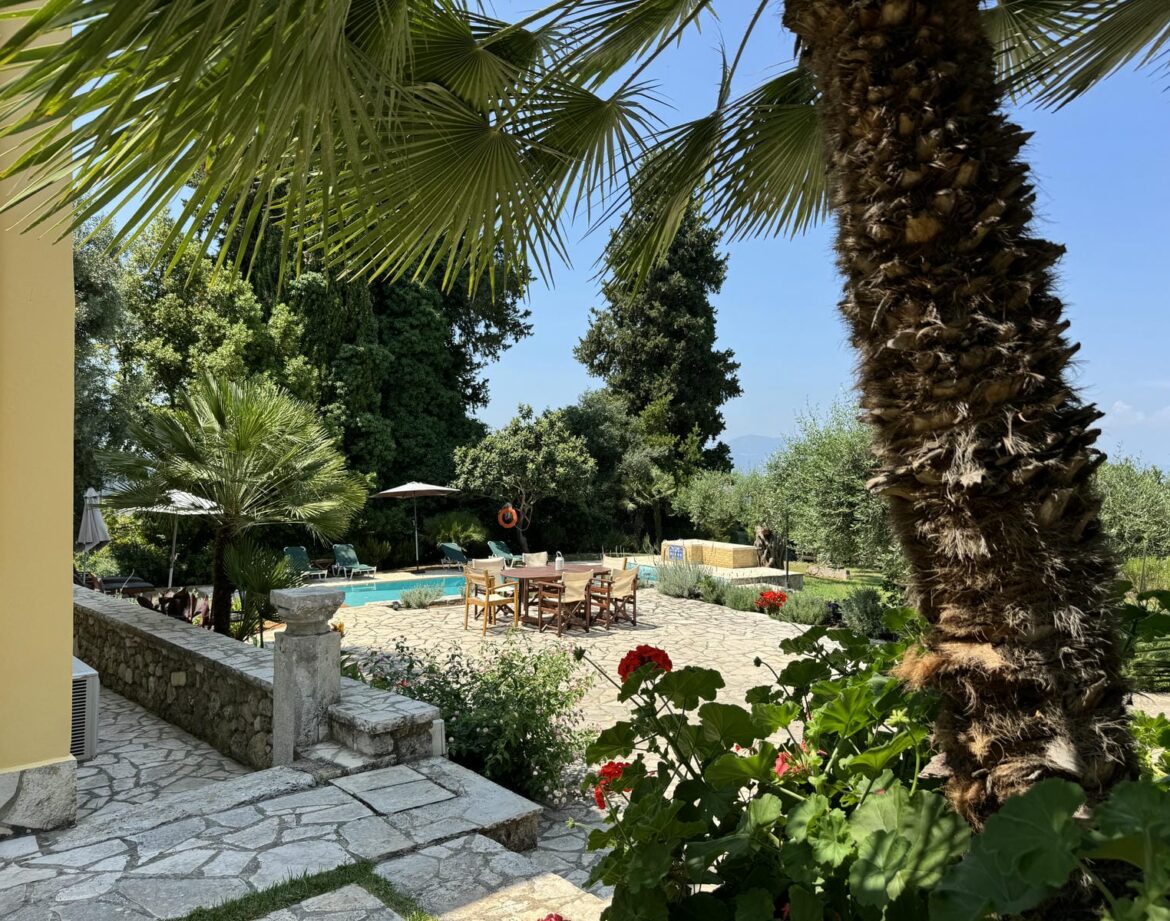 Set on the edge of the award-winning, picturesque village of Gastouri, the villa is a beautifully restored country house in classic style, surrounded by peace, privacy, and the lush greenery of rural Corfu. Once the home of the owners’ great-grandmother, Rossi — a Scottish lady who married a local Corfiot — the property has been lovingly brought back to life after standing untouched for many years, retaining its character while offering all the comforts of modern living.