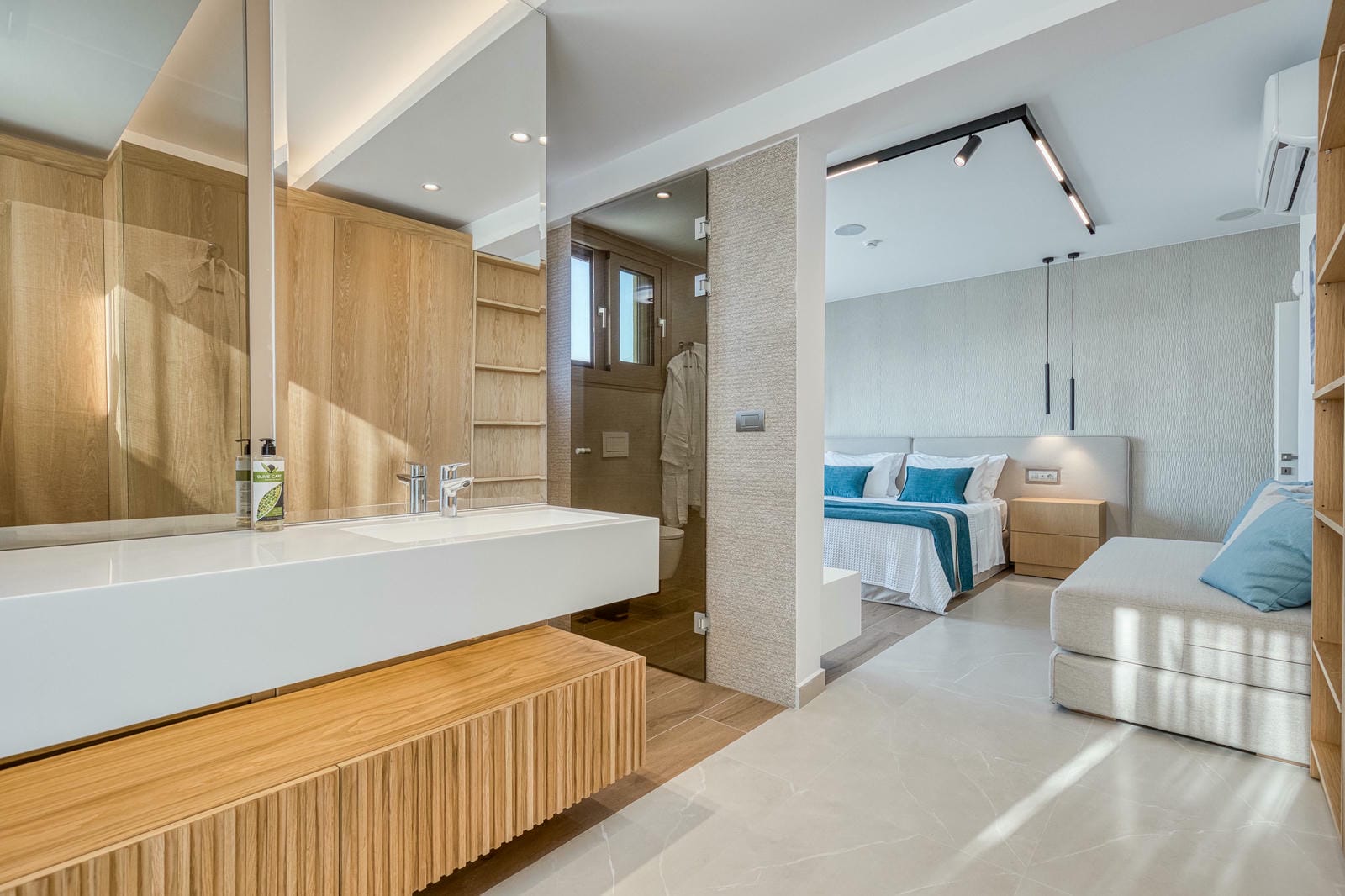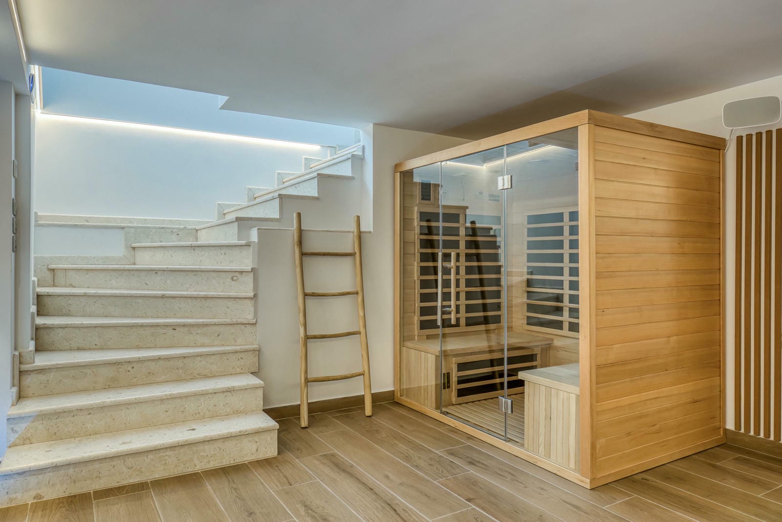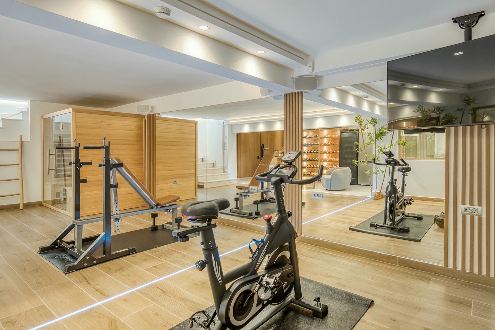 Wellness and relaxation are at the heart of the experience. Guests have access to a private gym and a modern sauna, creating a boutique spa atmosphere within your own villa.