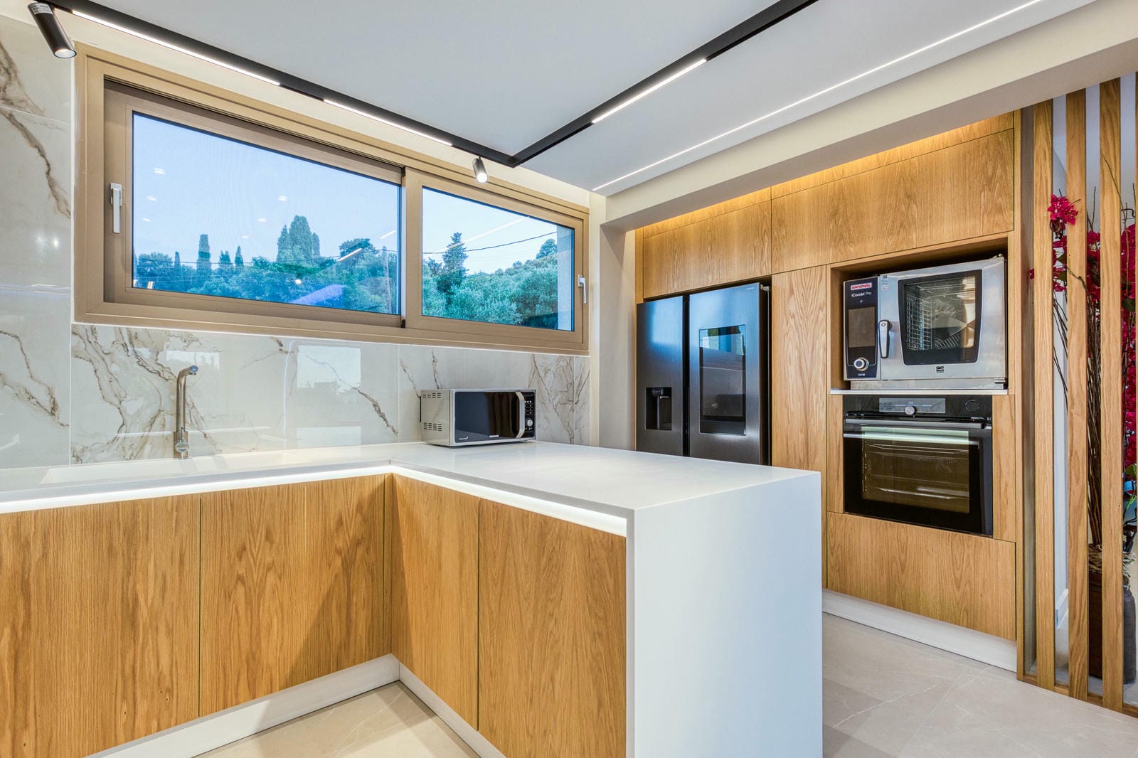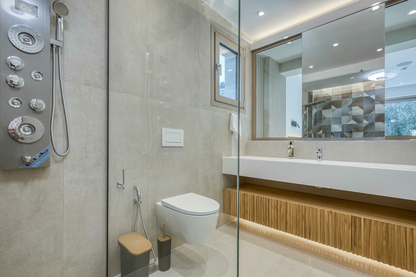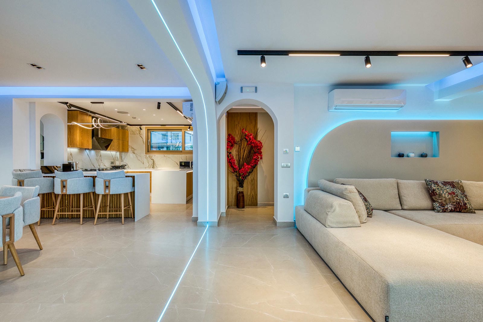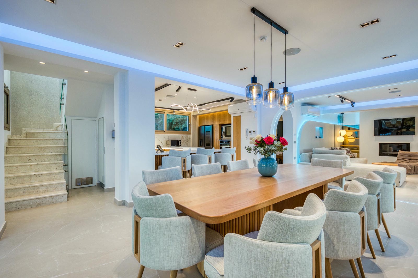 Set across a main house and a separate guest annex, the villa comfortably sleeps up to 12 guests in six en-suite bedrooms, all designed with clean, minimalist lines and high-end finishes. The interiors are flooded with natural light, combining open-plan living with floor-to-ceiling windows, sleek furnishings, and calming neutral tones but with a dash of super modern LED lighting.