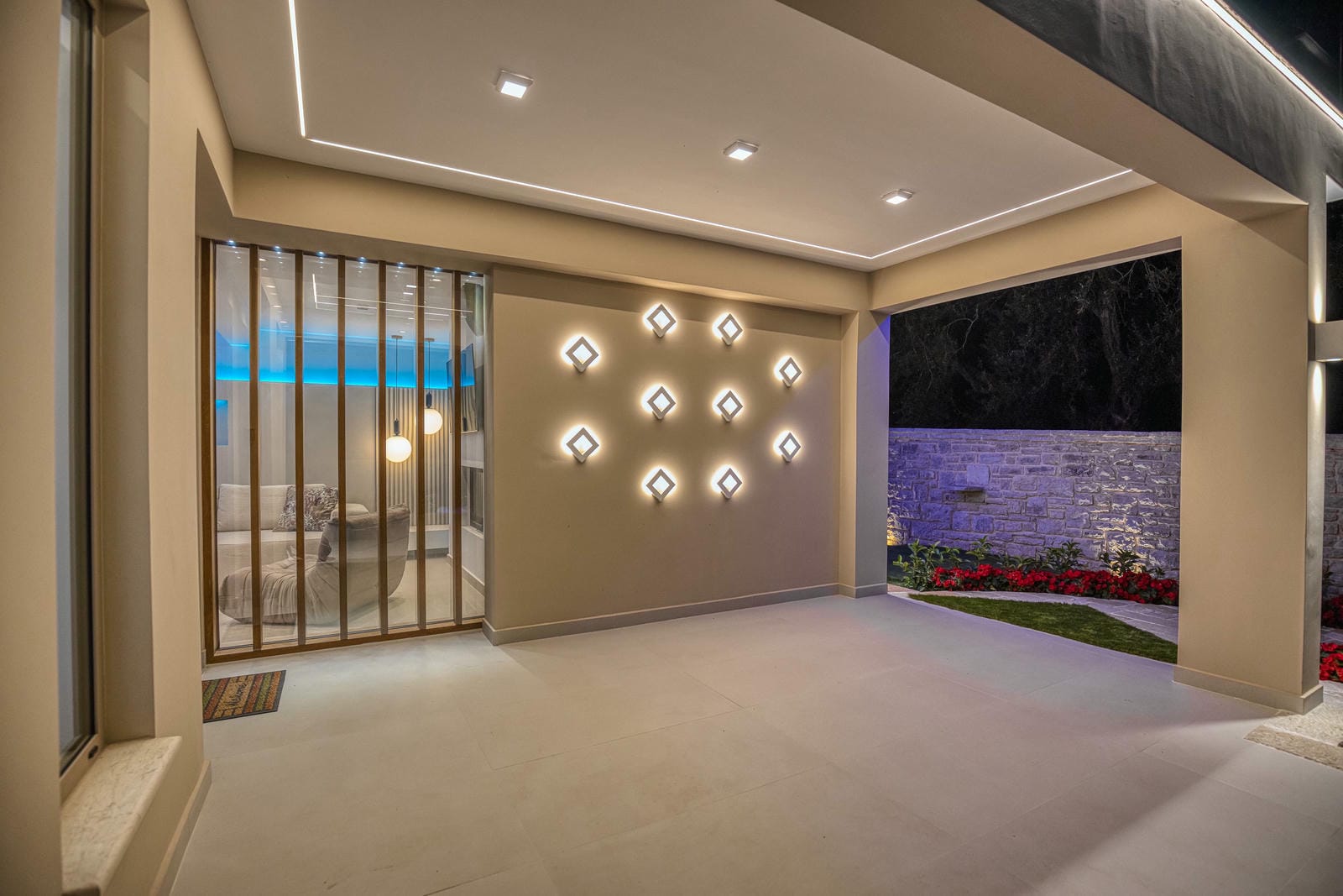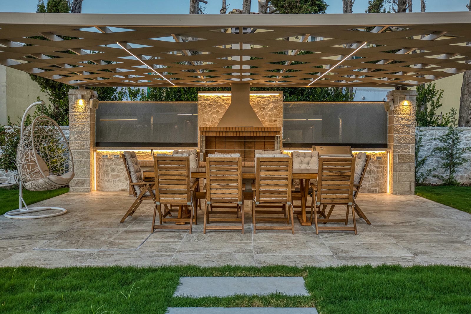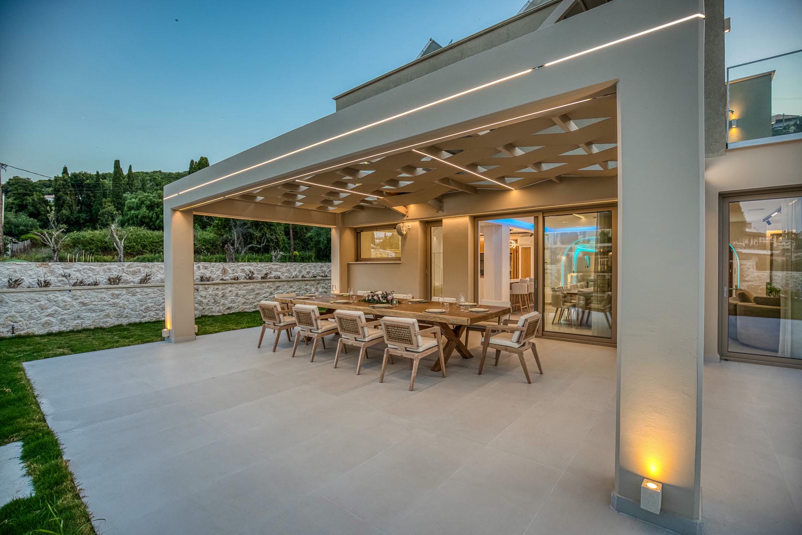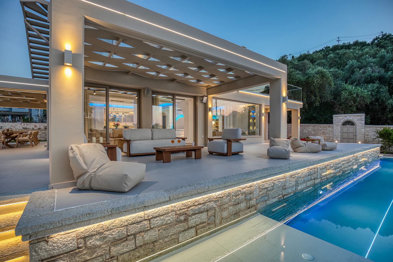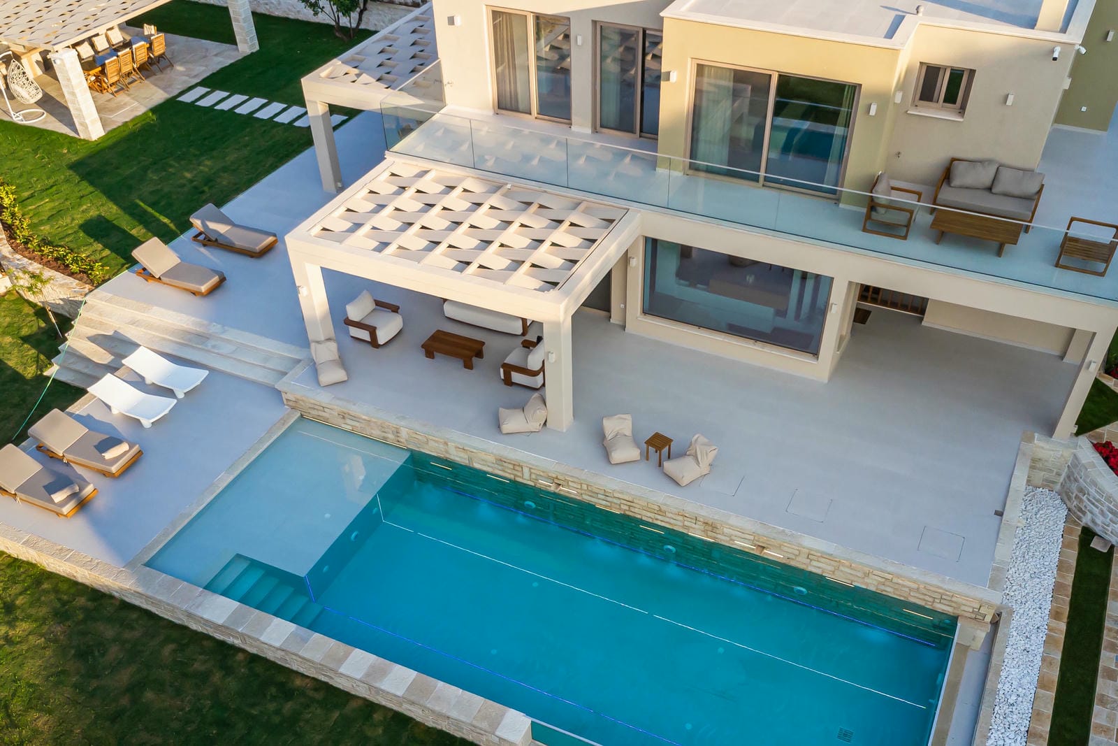 The villa’s outdoor spaces have been thoughtfully designed to maximize comfort and relaxation. A stylish pergola-covered lounge area features plush sofas and table — perfect for unwinding with a drink.