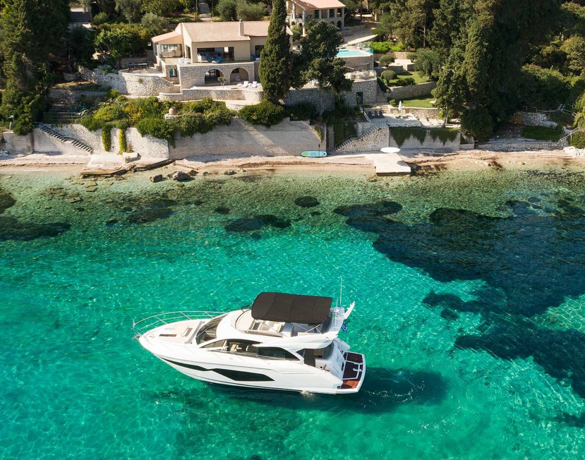 This stunning waterfront property consists of two beautifully appointed buildings, Villa Barbara & Villa Christina. The large living room of Villa Barbara with its exclusive F-Design Cheminee enjoys spectacular views of the Ionian Sea, adjacent is a modern kitchen and an airy, light dining room, the view room. In this area, it was important for the owners to create a sense of freedom and to emphasize the immediate proximity to the sea. Large sliding windows that can be fully opened and will disappear in the wall extending the room onto the terrace and gives an incomparable feeling of in and out. The glass enclosure of the terrace is only for security, but leaves the view clear, nothing keeps the eye and gives you the feeling of being on the deck of a ship. The large terrace runs around and also connects the two bedrooms. Furthermore, one bedroom has a direct exit to the pool, ideal for a midnight swim.